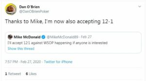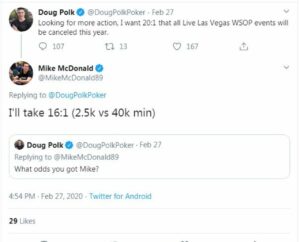 Για να το θέσουμε σε πιο… οικείους στοιχηματικούς όρους, ο McDonald θέλει να ποντάρει $2.500 σε απόδοση @17,00, ότι το WSOP 2020 θα ακυρωθεί και ψάχνει άτομο να δεχτεί το στοίχημα.