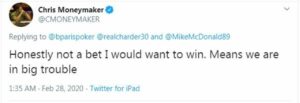 Ο Moneymaker, βλέποντας τις στοιχηματικές διαπραγματεύσεις σχετικά με την ακύρωση του WSOP 2020, σχολίασε, «Ειλικρινά, δεν είναι ένα στοίχημα που θα ήθελα να κερδίσω. Θα σήμαινε ότι έχουμε τεράστια προβλήματα.»