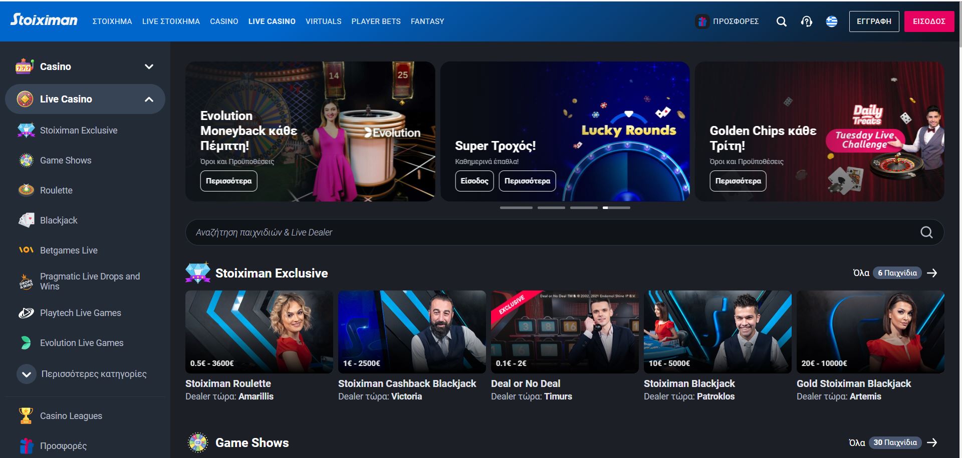 Η πρώτη σελίδα περιλαμβάνει κάποιες από τις σημαντικότερες τρέχουσες προσφορές* καζίνο και τα κορυφαία παιχνίδια ανά κατηγορία που μπορεί να βρει κάποιος στο Live casino του Stoiximan.