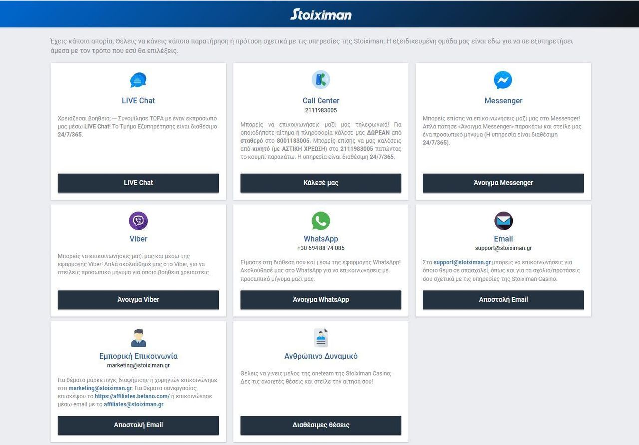 Οι τρόποι επικοινωνίας με το Stoiximan Καζίνο μεταξύ άλλων είναι: